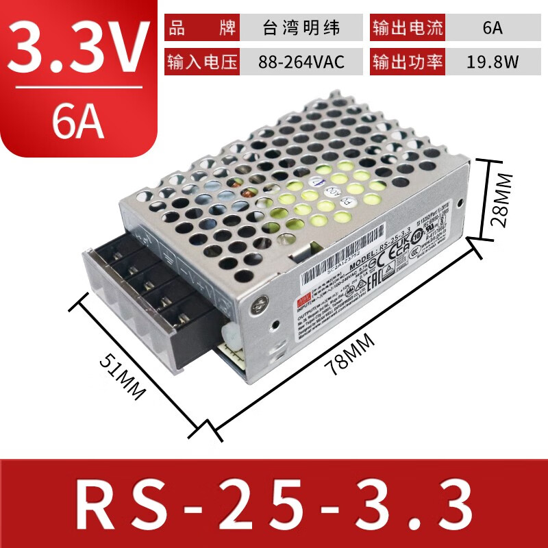明纬(MEANWELL)台湾明纬RS-25系列开关电源交流转直流变压稳压工控25W左右 RS-25-3.3【3.3V6A】无配件