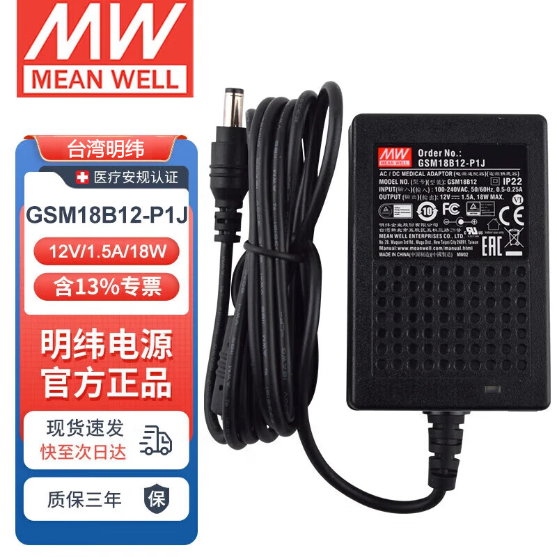 明纬(MEANWELL)开关电源12V24V GSM系列 电源适配器 三插进线 GSM18B12-P1J丨12V1.5A