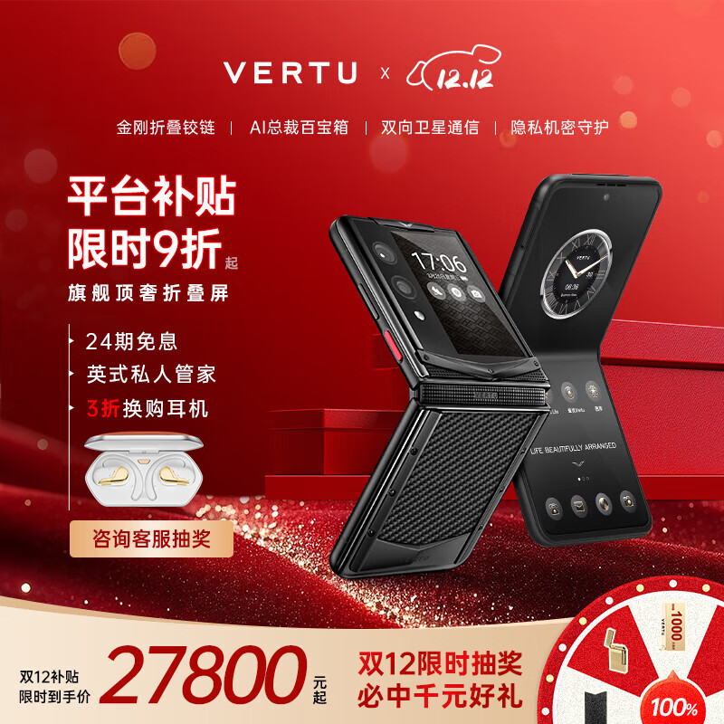 VERTU【大额补贴 历史底价】威图纬图奢品手机QUANTUM新品量子AI智能体小折叠屏手机FLIP商务礼物礼盒 黑色斜纹碳纤【京仓速发】 16GB+1TB 官方标配