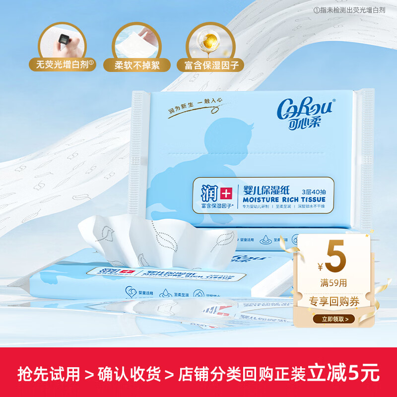 可心柔(COROU)V9婴儿纸巾3层M码120抽乳霜纸母婴宝宝云柔巾卫生纸抽纸 【试用回购正装立减5元】 3层 40抽*5包 S码
