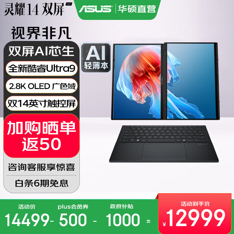 华硕灵耀14 双屏 2025【政府补贴】全新二代酷睿Ultra标压双触控屏AI轻薄商务办公笔记本电脑 U9-285H 32G 2T科技黑 2.8K 120Hz OLED屏 预装Office