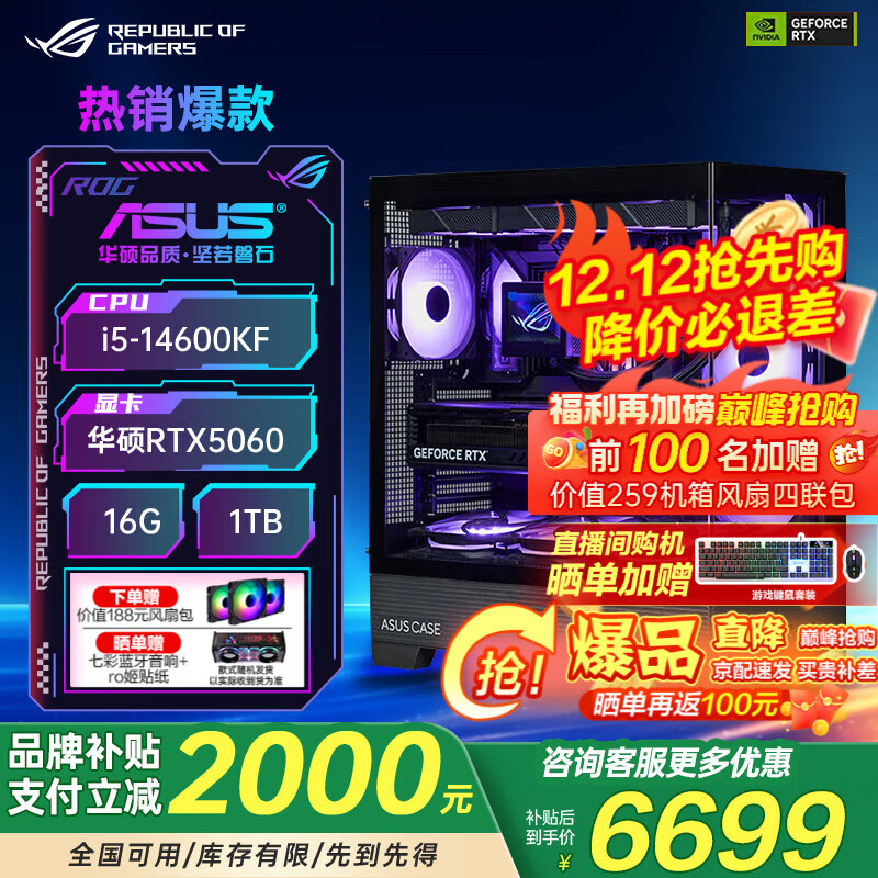 华硕ROG全家桶 14代cpu RTX5080/5070Ti/5060Ti显卡主机 电竞游戏直播设计DIY海景房台式组装电脑整机 配置一:i5-14600KF/5060/16G 主机套装