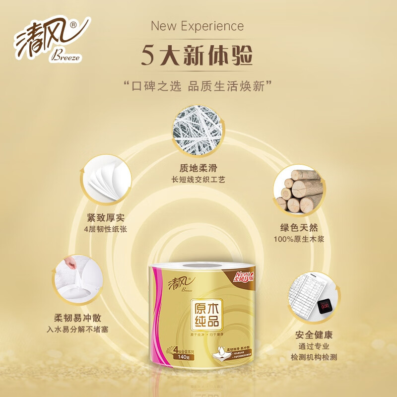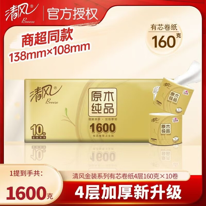 清风清风金装卷纸原木纯品有芯卷筒卫生纸厕纸4层10卷1600克家庭装 1提10卷1600克