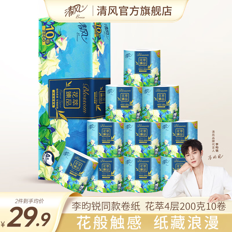 清风【包邮】花萃臻品系列卷纸4层200克卷筒纸厕纸家庭整箱装卫生纸巾 4层 200g/卷*10卷