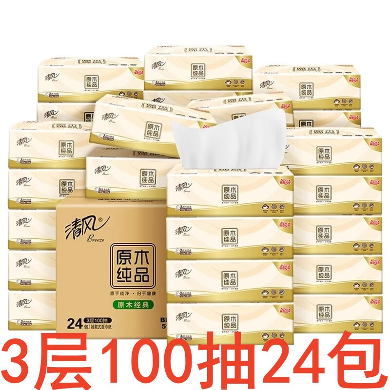 清风 抽纸 原木纯品 3层100抽 餐巾纸 卫生纸 可湿水面巾纸 家庭装 3层 100抽*30包
