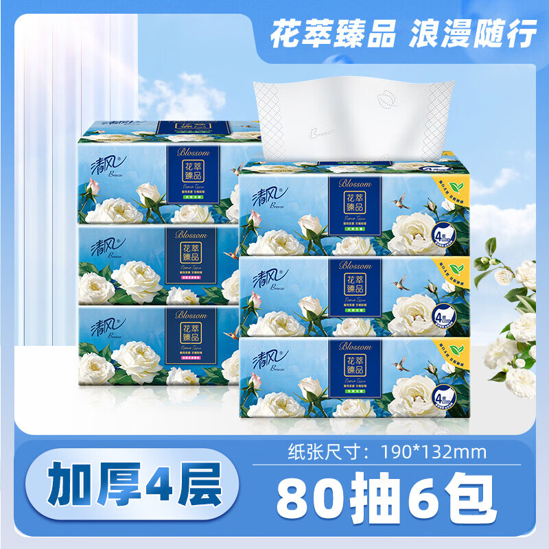 清风(APP)花萃臻品4层320张12包抽纸擦手纸家用卫生面巾纸家庭实惠装 【超性价比】花萃4层320张6包