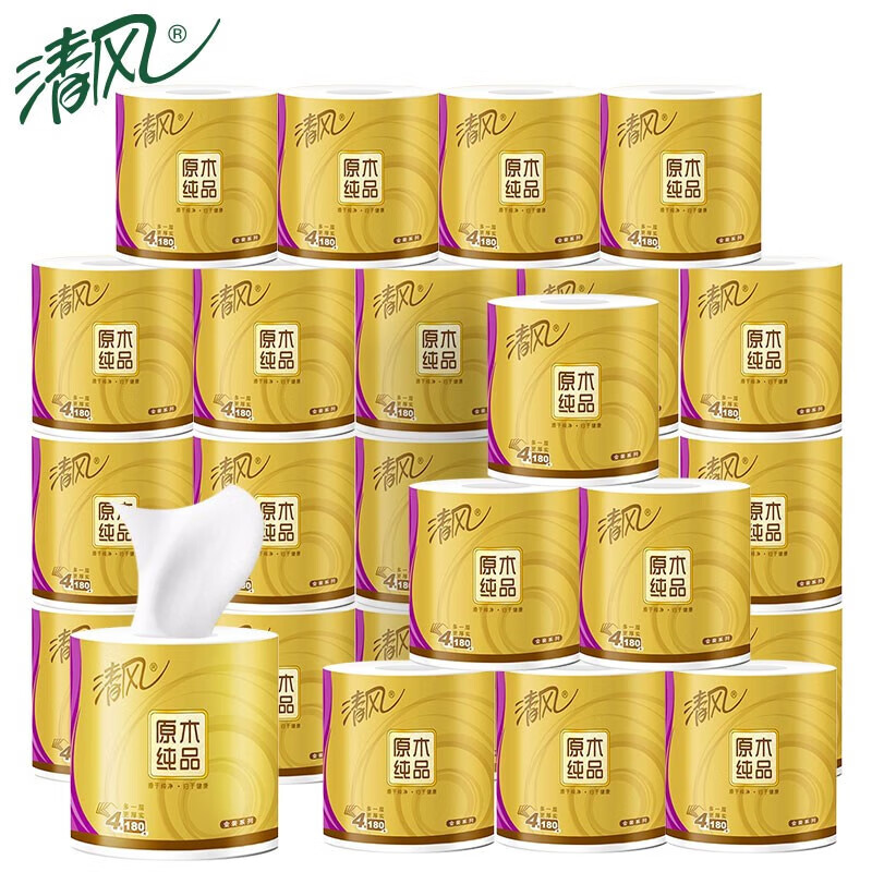 清风 4层180克27卷 原木纯品金装卫生纸卷纸家庭装纸巾整箱