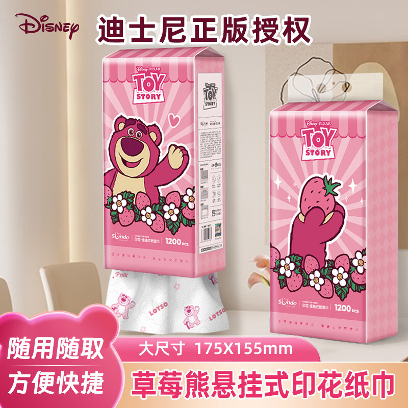 洁良品草莓熊印花原浆纸1200张家庭挂抽加大实惠装 迪士尼草莓熊大挂抽1提装(满3提