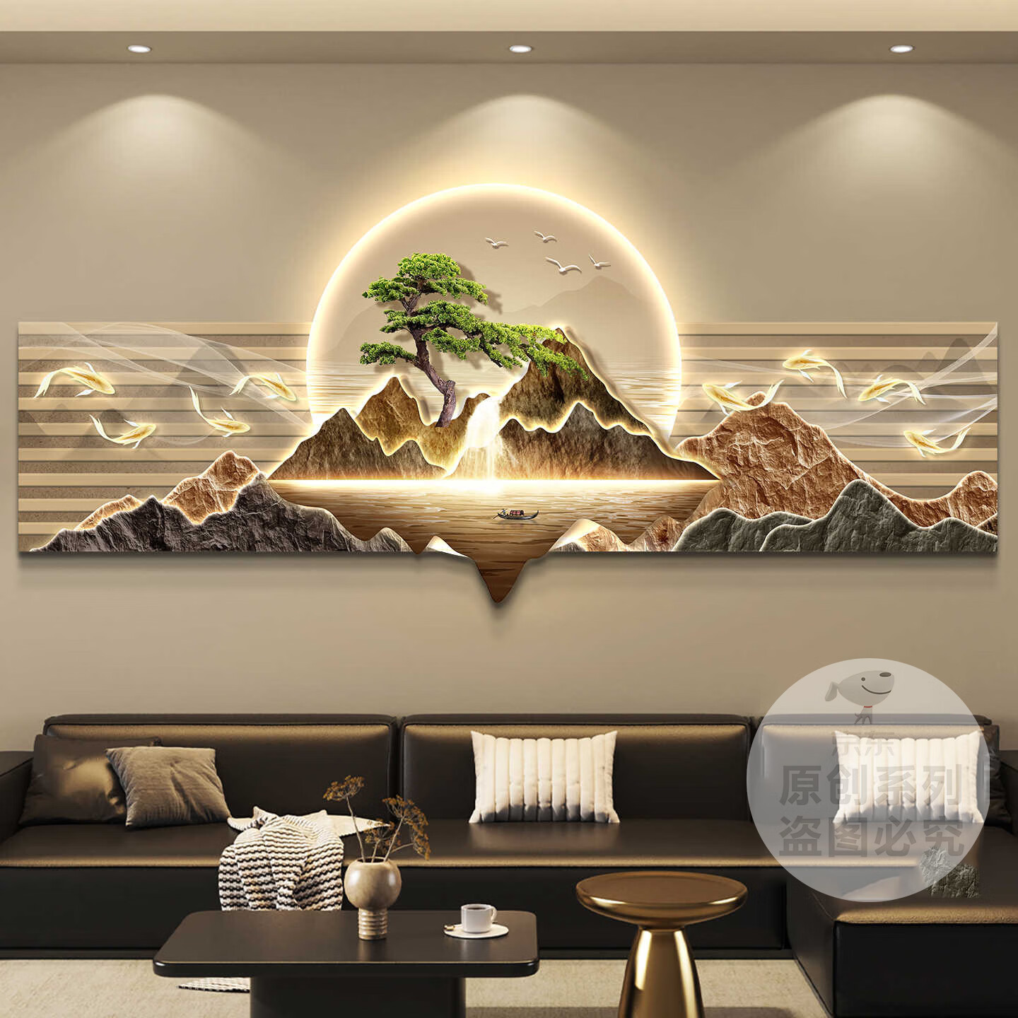 耀世佳画九鱼图轻奢led灯客厅装饰画沙发背景墙挂画2025新款大气山水壁画 Z7170-九鱼聚财 130*50cm 晶瓷防刮画面【无灯】 双层叠加UV精雕无框工艺+高档晶瓷画面