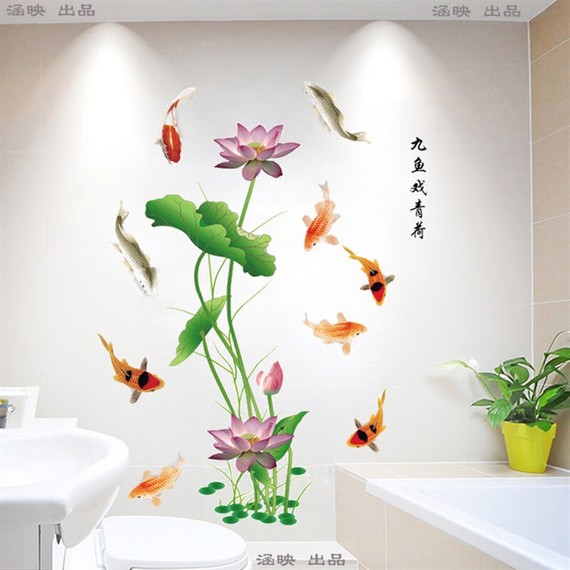 荷花鲤鱼图卫生间贴画厕所装饰布置洗澡间防水3d立体房间墙面 军绿色 九鱼戏青荷 特大