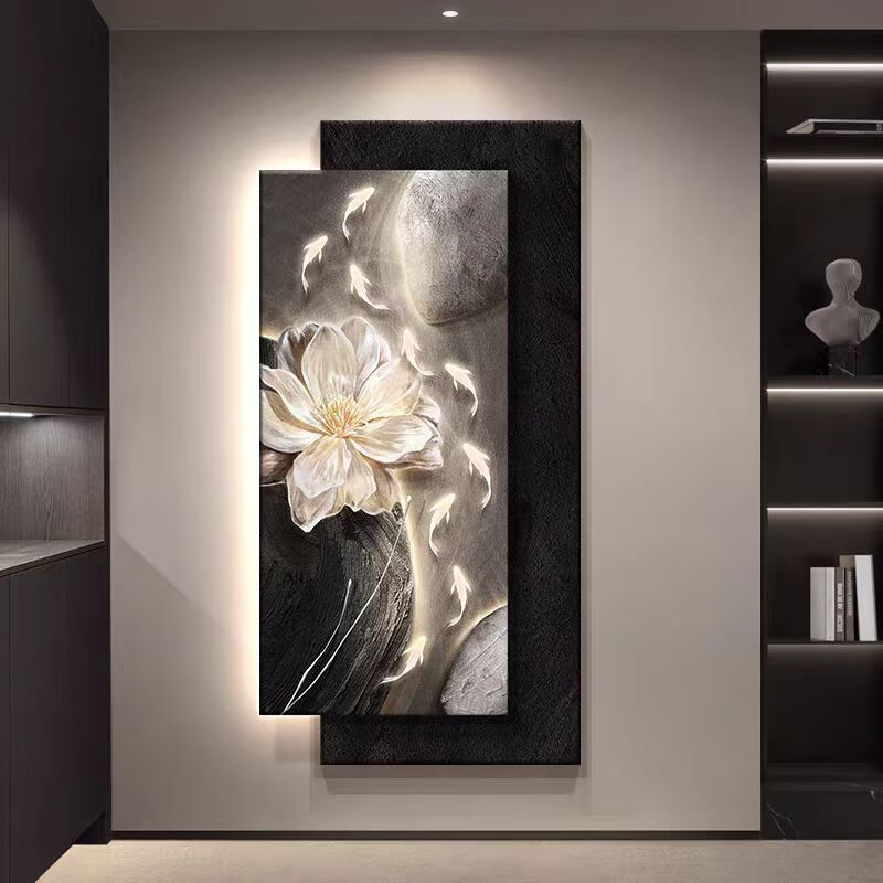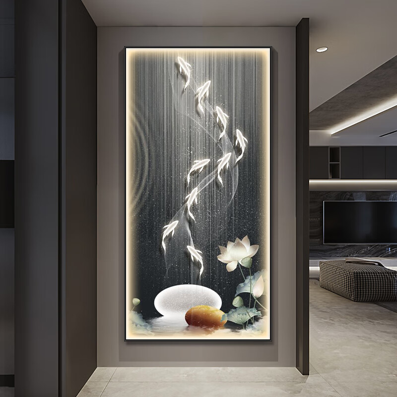 画测九鱼图走廊过道装饰画入户正对门玄关画Led带灯轻奢竖版简约挂画 Z4821(主图热卖款) 40*80(建议0.6米-0.7米墙面) 纹理面+铝合金金框