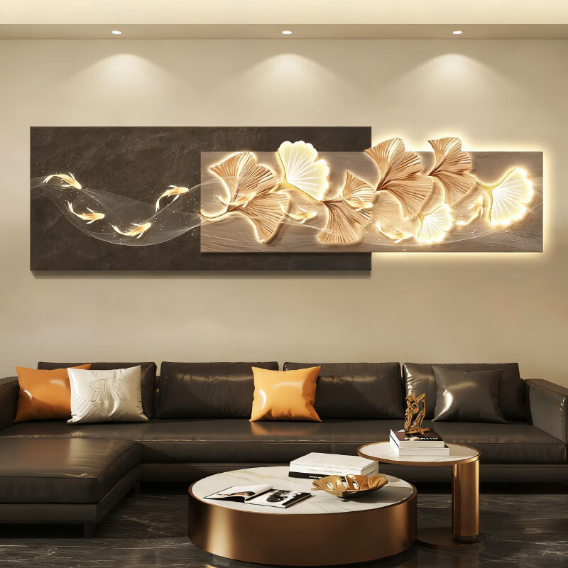 槐序银杏叶客厅装饰画现代轻奢九鱼图高档创意沙发背景墙两联叠加挂画 Z7450-杏福美满 120*34cm 晶瓷防刮画面【无灯】
