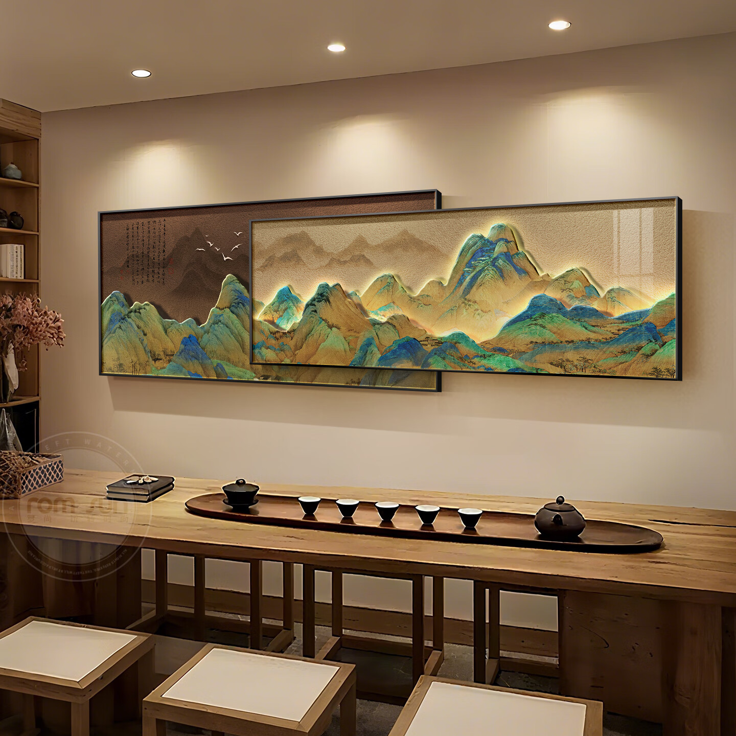 奥瀚千里江山图茶室装饰画新中式客厅横幅壁画宋代美学沙发背景墙挂画 JD32115千里江山 80*30/80*20 质感油画布环保黑框