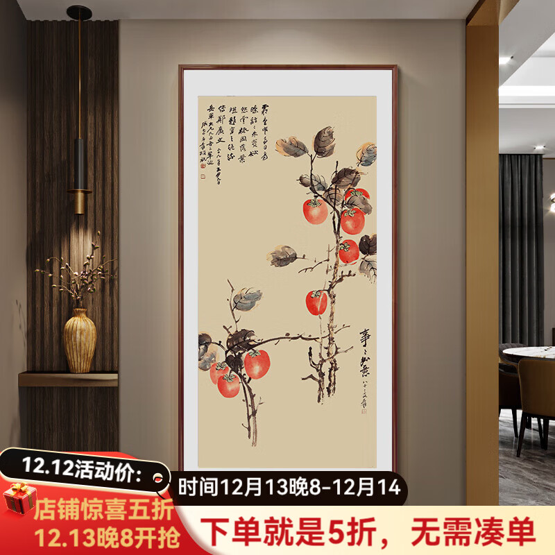 良木新中式九鱼图玄关装饰画正对门竖版入户走廊尽头挂画事事如意壁画 J-柿柿如意(新款) 80*160CM-雅致柚木框-高清微喷SA1