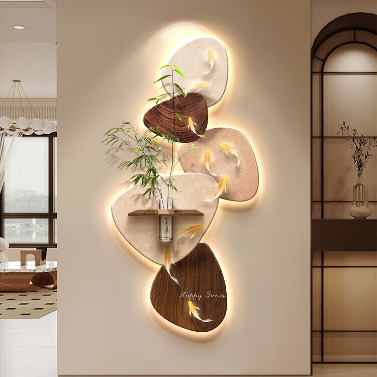 感画九鱼图玄关装饰画中古风走廊过道挂画入户正对门水培绿植砂岩壁画 JD32226锦鲤跃福 40*80+置物架20*12 手工砂岩颗粒感【无灯】 置物架+麻绳+水培花瓶+仿真绿植