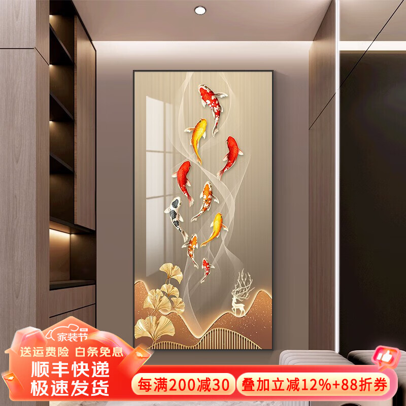 九鱼图玄关装饰画2025新款轻奢好寓意过道走廊尽头挂画入户门壁画 B款 60*120cm 百搭铝合金黑色边框+晶瓷
