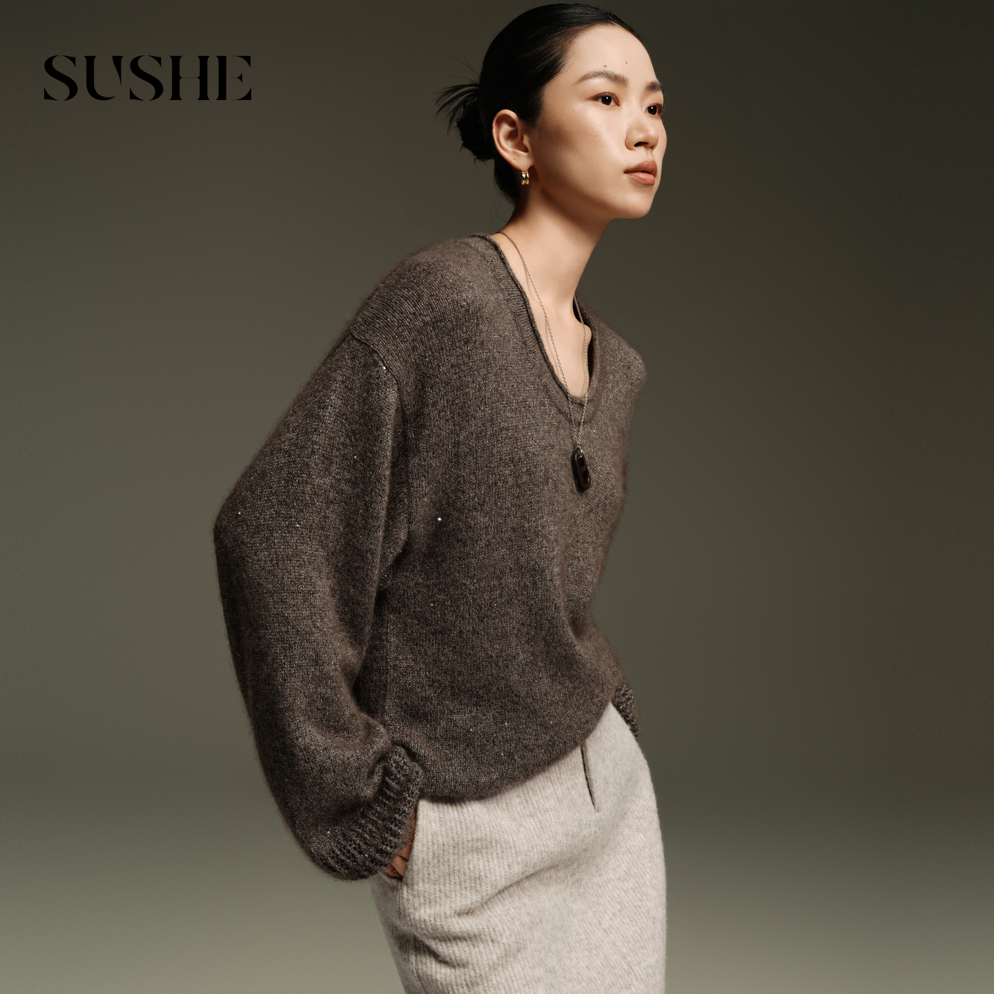 束皙SUSHE 星曳 法式慵懒 细闪羊绒羊毛卷边领镂空蝙蝠袖针织衫秋 沙海咖 S