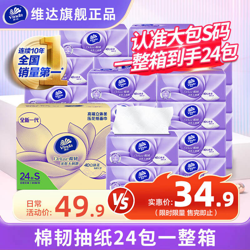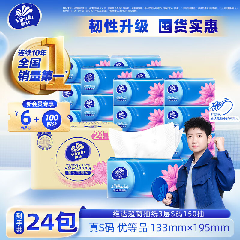 维达(Vinda)【孙颖莎同款】抽纸 超韧韧性升级3层真S码 卫生纸餐巾纸面巾纸 3层 150抽*24包 箱装实惠