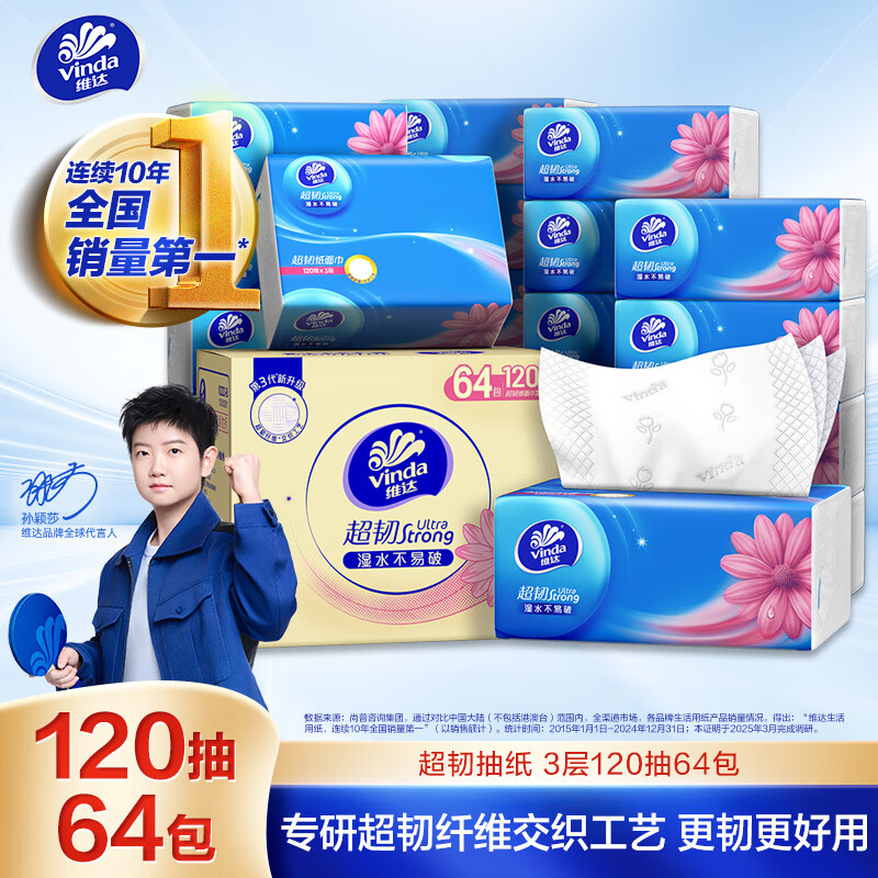 维达(Vinda)抽纸 【孙颖莎推荐】超韧120抽 64包S码 湿水不易破 餐巾纸 整箱