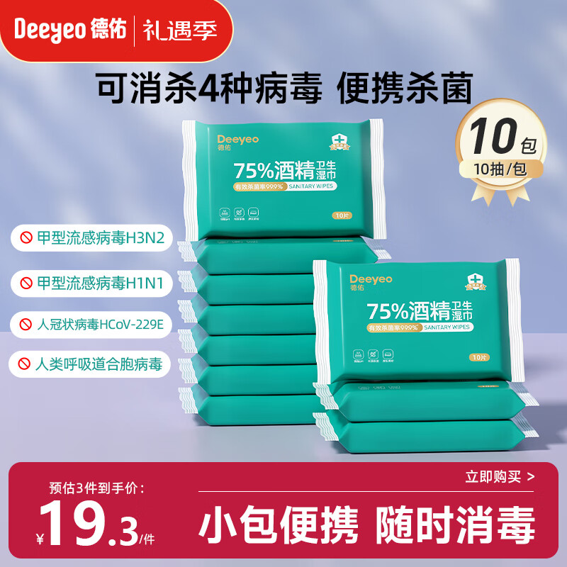 德佑酒精消毒湿巾10抽*10包 75%酒精便携湿纸巾 杀菌率99.9% 医护级