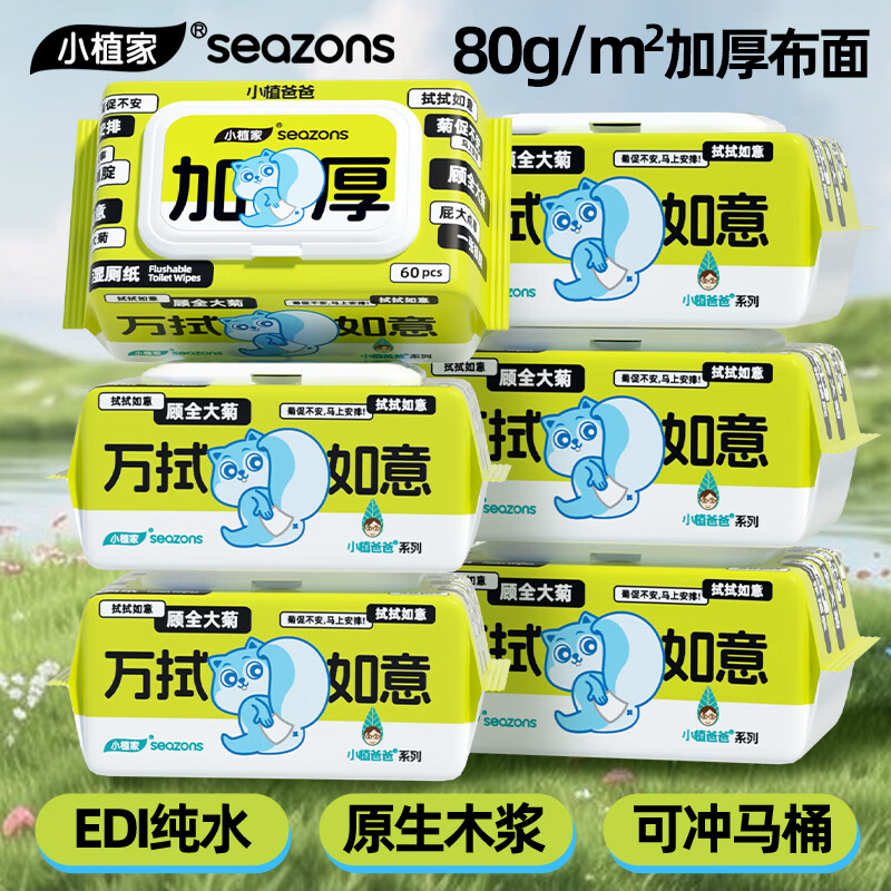 小植家纯水湿厕纸家庭装男女士成人洁厕湿纸巾专用厕所湿巾可冲马桶 【80克布面】 60抽*6包 加厚款