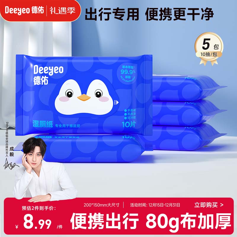 德佑企鹅湿厕纸小包便携10抽*5包 厕纸湿巾洁厕如厕湿纸巾 新客尝鲜