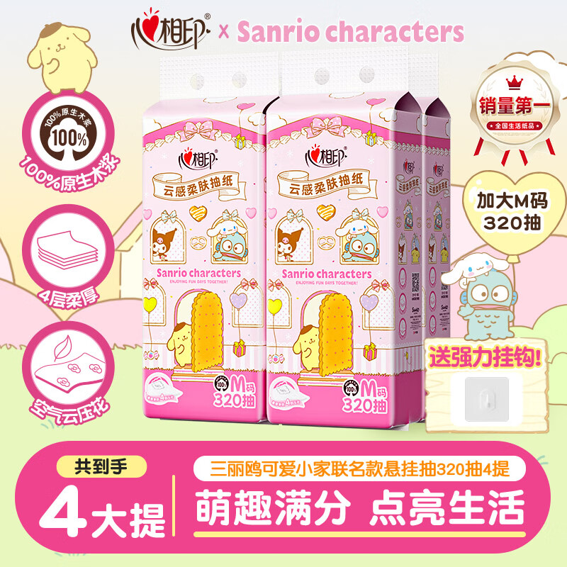 心相印抽纸云感悬挂式面巾纸家用实惠装餐巾纸M码 4层320抽*4提三丽鸥家族联名送挂钩