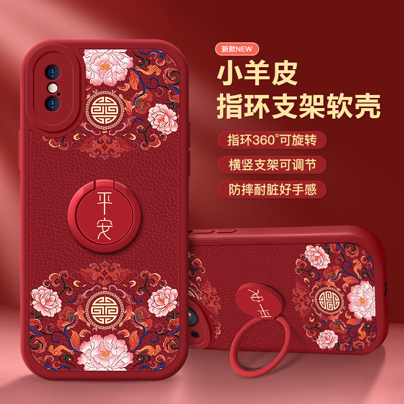 彩绘师适用苹果xsmax手机壳17promax国潮卡通熊猫iPhoneX/XR全包防摔硅胶小羊皮17Air创意指环支架男女款 苹果XSMax【红平安花纹】带支架