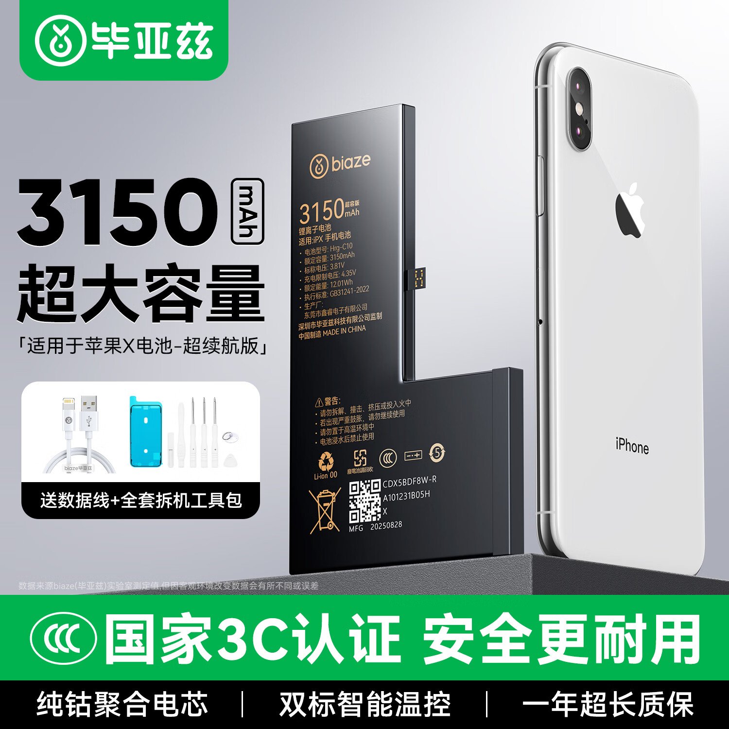毕亚兹适用于苹果X电池 iPhonex电池3150mah毫安大容量手机内置电池自主更换支持快充 附安装工具 DC-9
